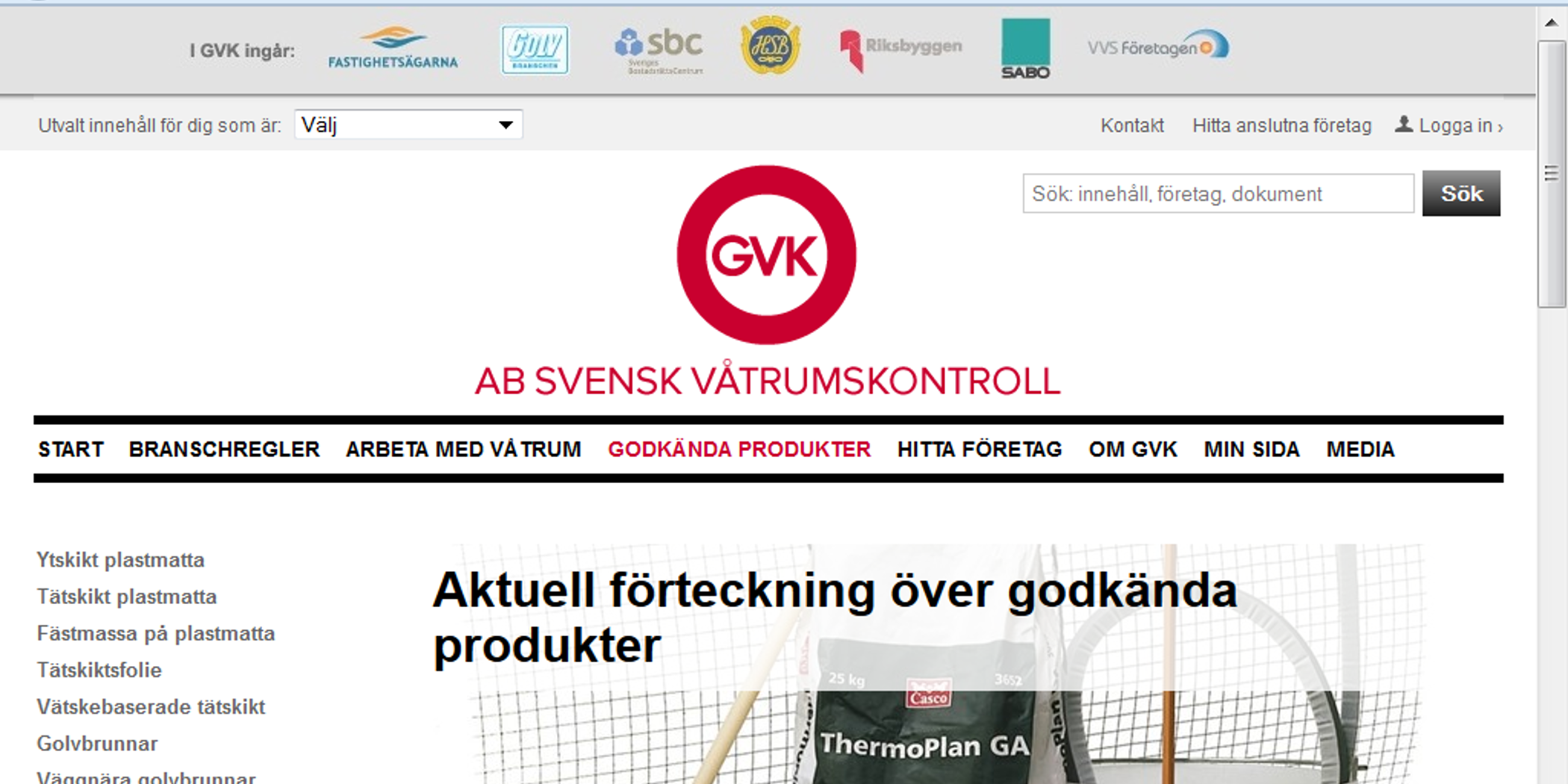 På GVKs hemsida finns alla produkter som är godkända för våtrumsinstallationer listade. Plastmatta som tätskikt och/eller ytskikt, tätskiktsfolie, golvbrunnar, väggnära brunnar (så kallade designbrunnar), fästmassa och vätskebaserade tätskikt. Det är branschorganisationernas godkännande som avgör om en produkt finns med på listan eller inte.