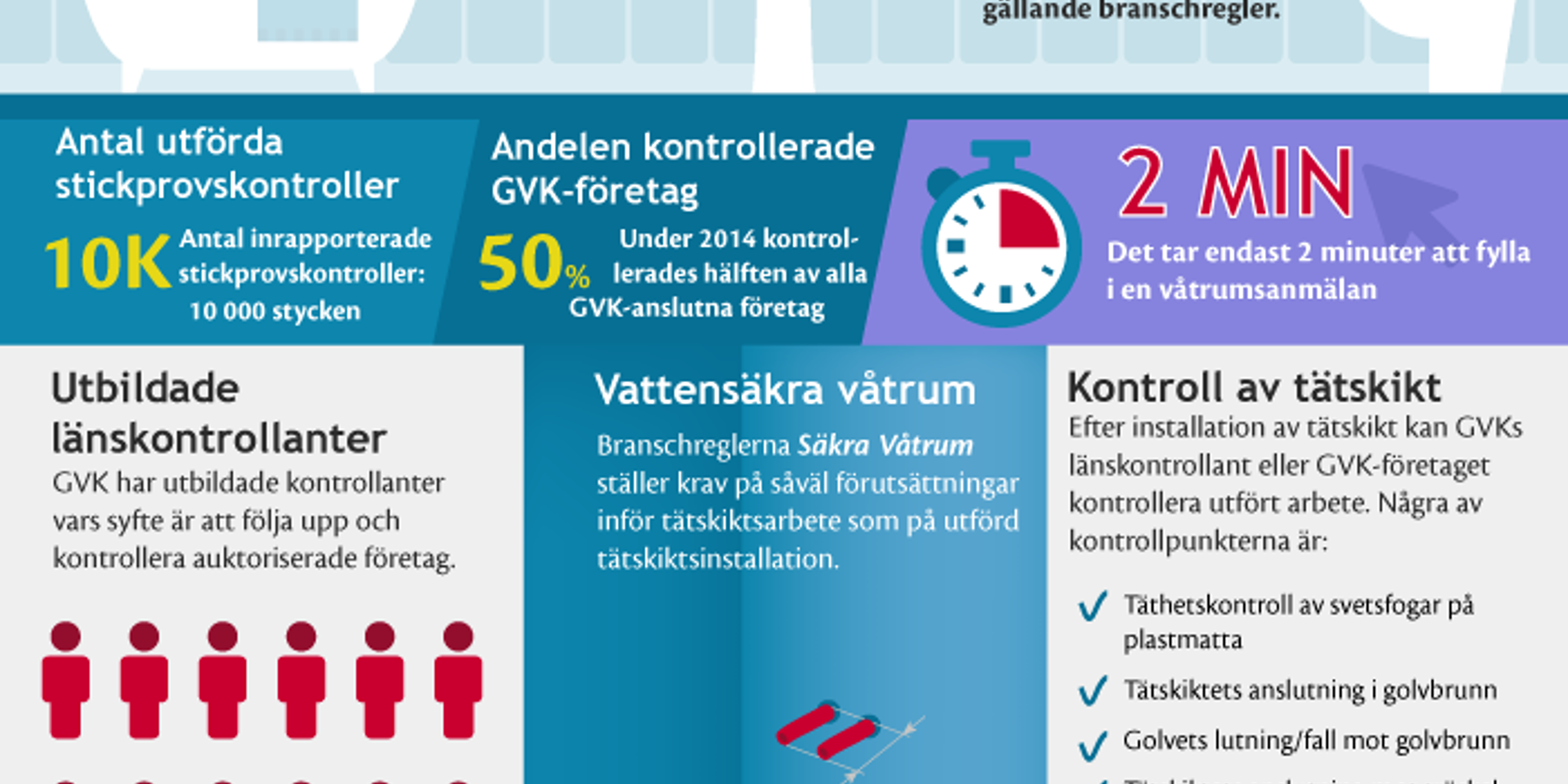 Men en våtrumsanmälan har fler funktioner. I GVK-konceptet ingår stickprovskontroller av att tätskiktet verkligen håller tätt. Länskontrollanterna, vars syfte är att följa upp och kontrollera de auktoriserade företagens jobb, utgår från våtrumsanmälningarna i sina slumpmässiga kontroller. Man kontrollerar bland annat svetsfogar och tätskiktets anslutning till golvbrunn, trösklar och rör. Antalet inrapporterade stickprovskontroller är drygt 10 000, vilket i sin tur innebär att hälften av alla GVK-anslutna företag blev kontrollerade förra året. Resultaten från stickprovskontrollerna rapporteras tillbaka till GVK. En våtrumsanmälan betyder alltså både trygghet för beställaren och en vattensäker utveckling av branschen.