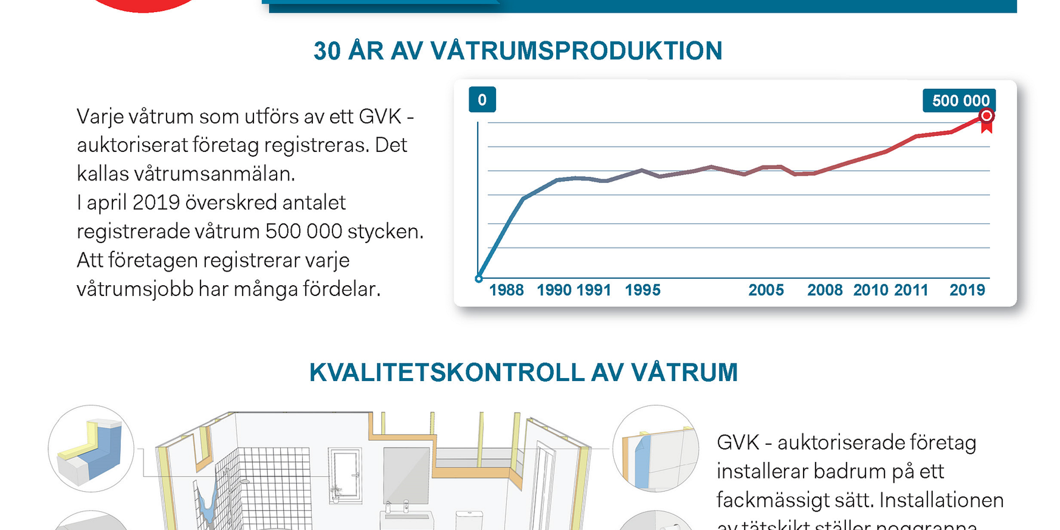 Nyligen nådde GVK-auktoriserade företag en magisk gräns, nämligen en halv miljon registrerade badrum. Den stora fördelen med registreringen, våtrumsanmälan, är att kunskap återförs till branschen – något GVK arbetat kontinuerligt med sedan 1988. Det leder i sin tur till allt säkrare badrum. Brist på återföring av erfarenheter pekas ut som en viktig orsak till skador och byggfel i byggsektorn.