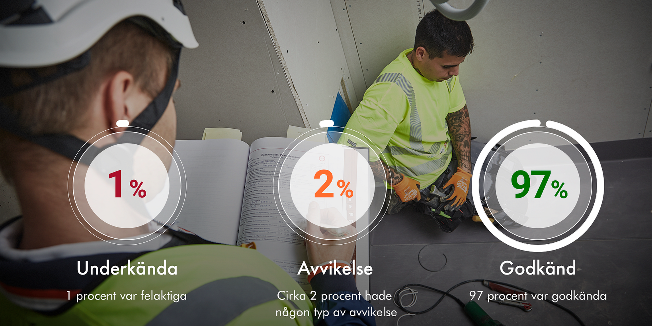 Siffrorna bygger på stickprov som utförs av branschens 20 kontrollanter. Av de kontrollerade våtutrymmena var 97 procent felfria, 2 procent visade någon form av avvikelse och 1 procent var felaktigt installerade.