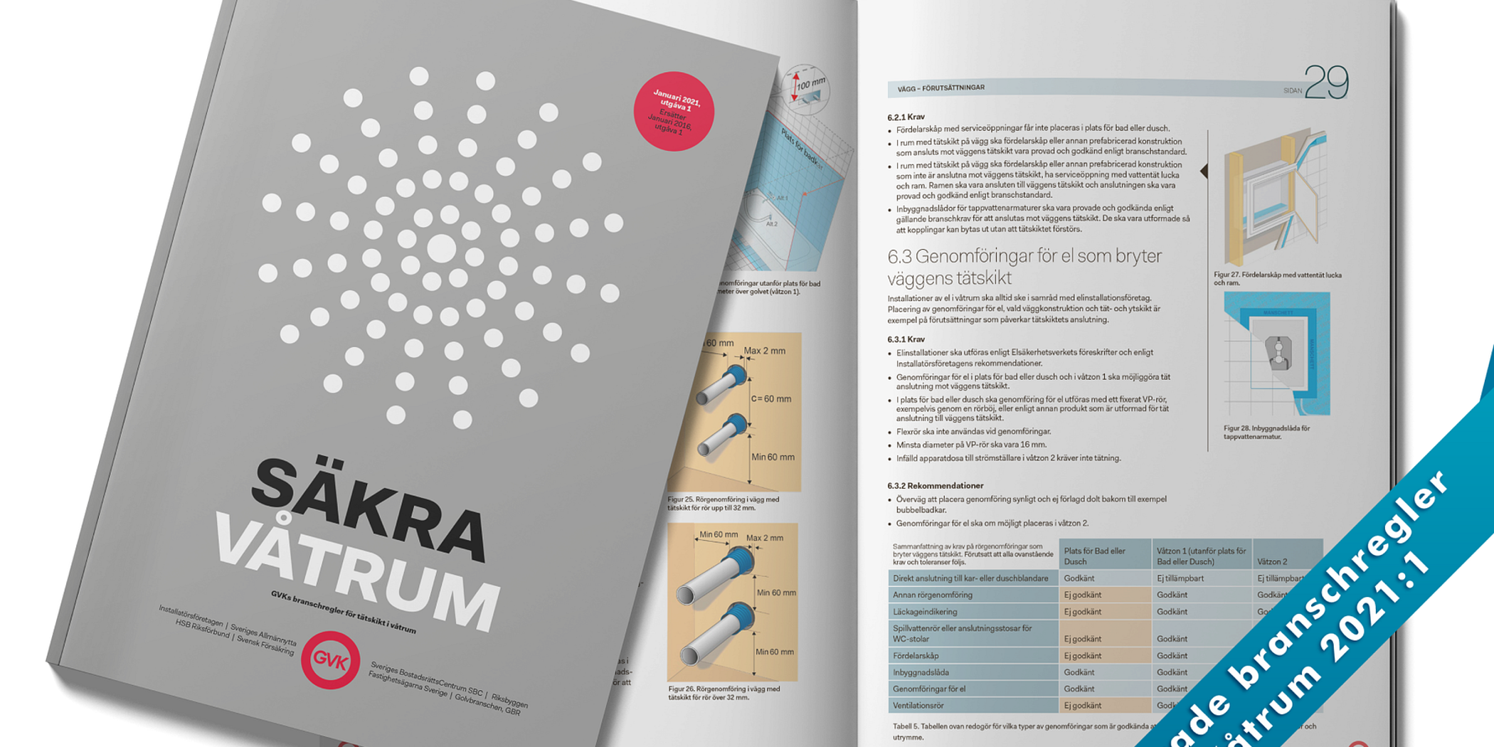 Branschreglerna Säkra Våtrum uppdateras den 1 januari 2021. Reglerna är samordnade med de närbesläktade branschorganisationerna Säker Vatten och BKR, Byggkeramikrådet. I en serie artiklar kommenterar GVK de viktigaste förändringarna i branschreglerna, varför de gjorts och vad det rent praktiskt innebär för våtrumsentreprenören. Säkra Våtrum 2021:1 gäller samtliga installationer som påbörjas efter 1 januari 2021.