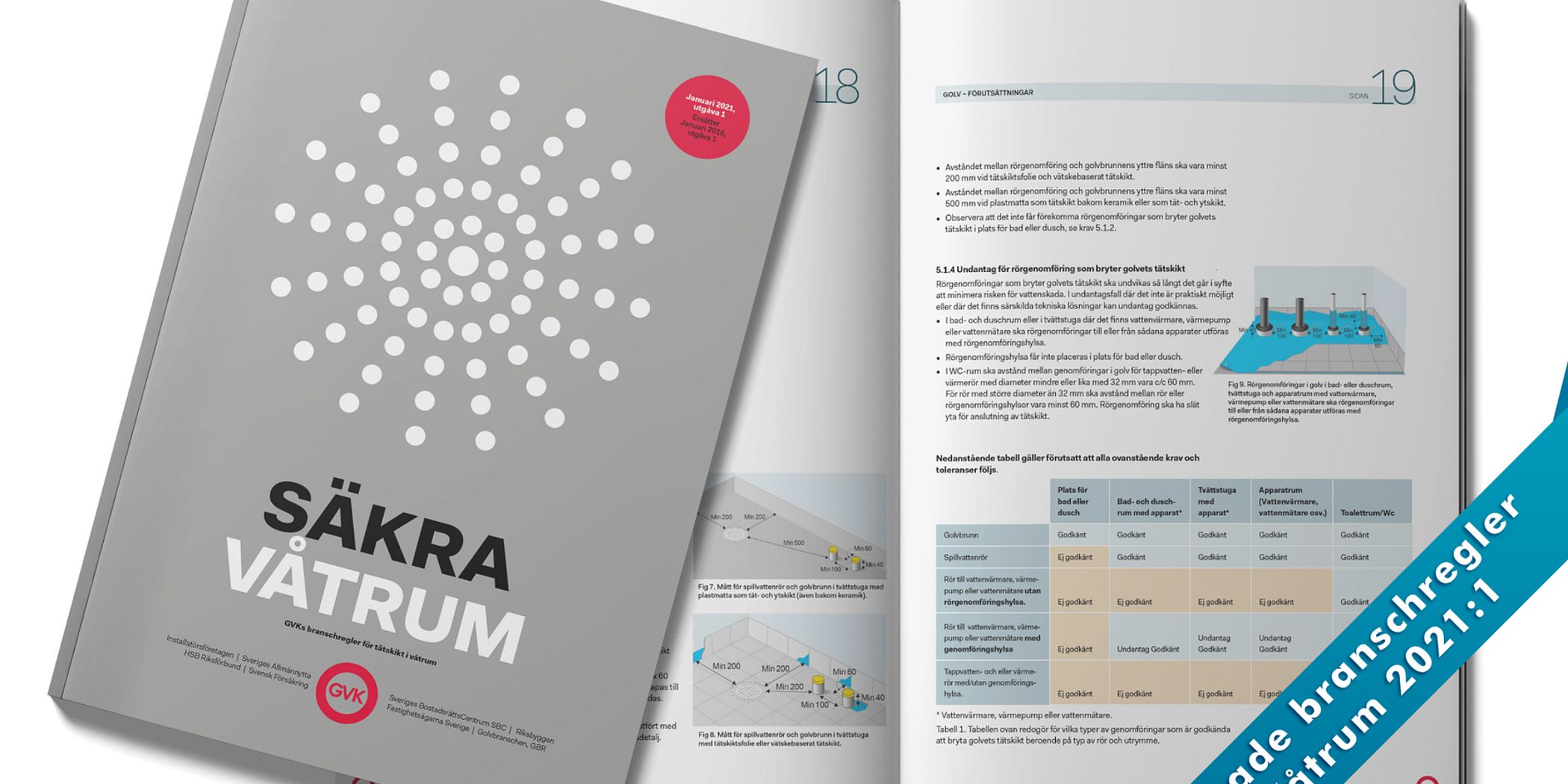Branschreglerna Säkra Våtrum uppdateras den 1 januari 2021. Reglerna är samordnade med de närbesläktade branschorganisationerna Säker Vatten och BKR, Byggkeramikrådet. I en serie artiklar kommenterar GVK de viktigaste förändringarna i branschreglerna, varför de gjorts och vad det rent praktiskt innebär för våtrumsentreprenören. Säkra Våtrum 2021:1 gäller samtliga installationer som påbörjas efter 1 januari 2021.