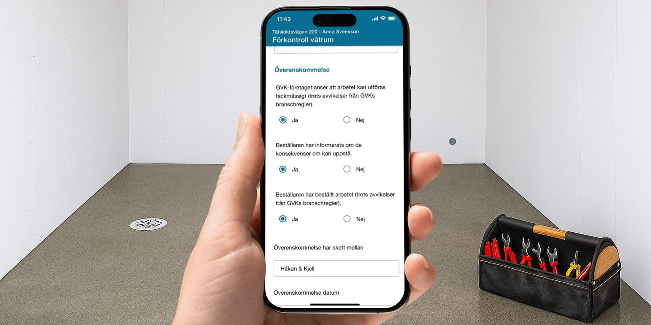 Rätt förutsättningar innebär att de tekniska krav som finns i branschreglerna är uppfyllda. Det är dessa krav som kontrolleras och dokumenteras i förkontrollen. Med hjälp av appen Golv- & Våtrumskontroll går montören systematiskt igenom ett stort antal kontrollpunkter, så som golvlutning och rörgenomföringar, och kan snabbt upptäcka om något inte stämmer.